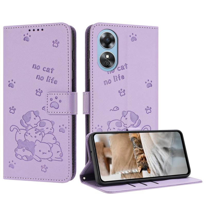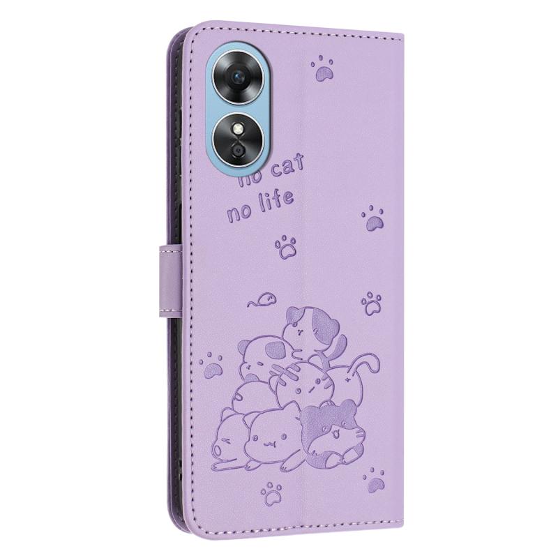 For OPPO A17 4G Global Embossed Kitten Phone Leather Case with Lanyard(Purple)