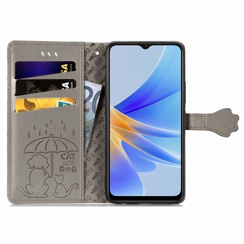 For OPPO A17 Cat and Dog Embossed Leather Phone Case(Gray)