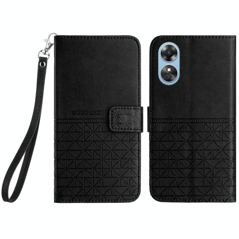 For OPPO A17 Rhombic Texture Leather Phone Case with Lanyard(Black)