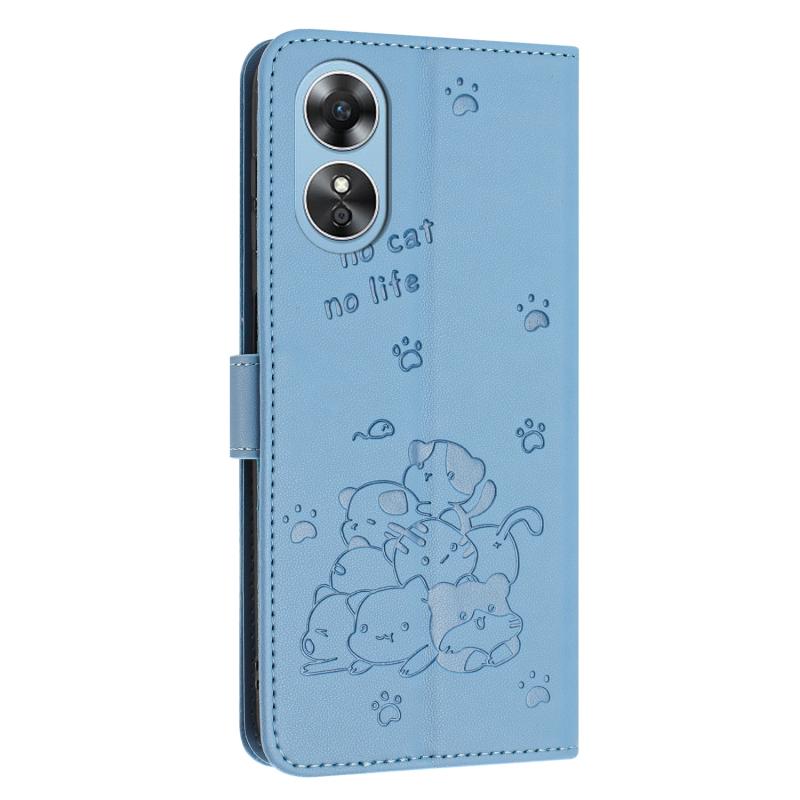 For OPPO A58 4G Embossed Kitten Phone Leather Case with Lanyard(Blue)