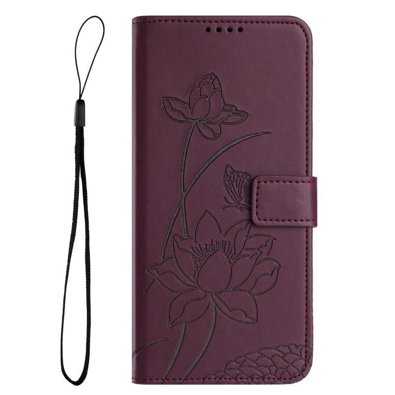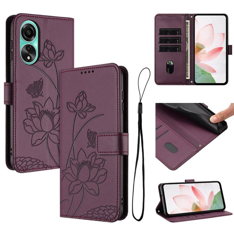 For OPPO A58 4G Lotus Embossed Leather Phone Case with Lanyard(Wine Red)