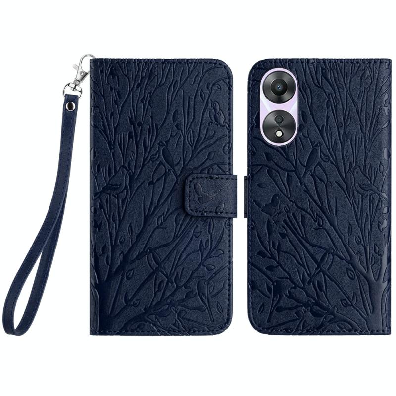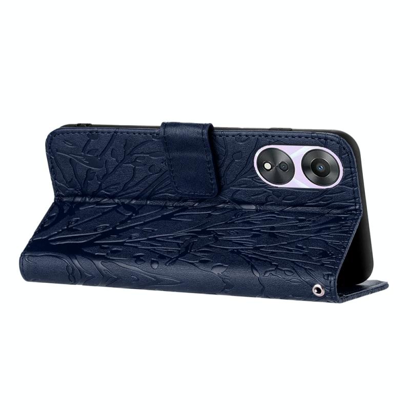 For OPPO A58 / A78 Tree Birds Embossed Pattern Leather Phone Case(Blue)