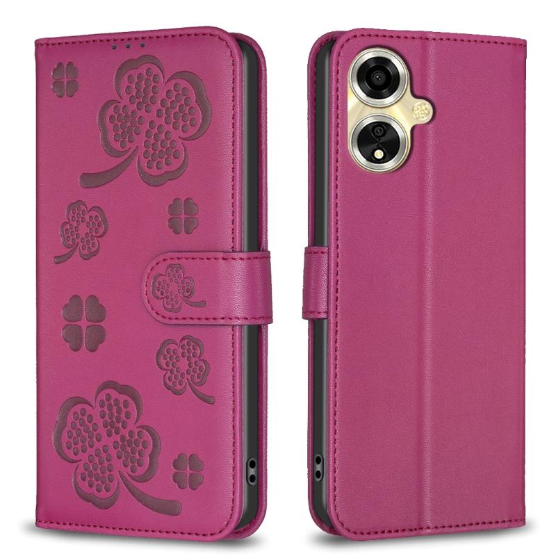 For OPPO A59 5G Four-leaf Embossed Leather Phone Case(Rose Red)