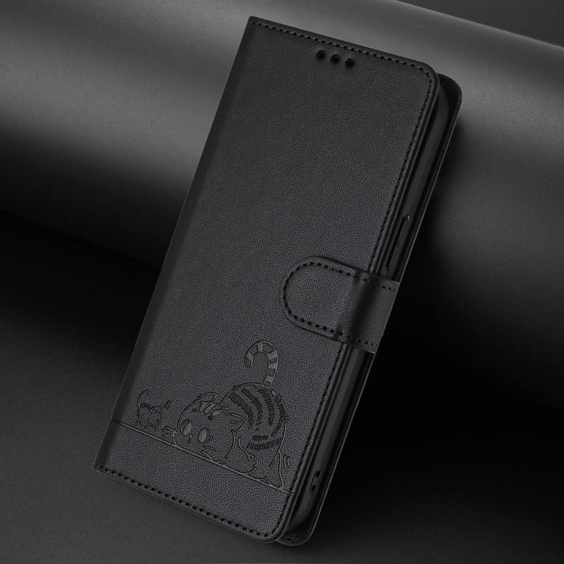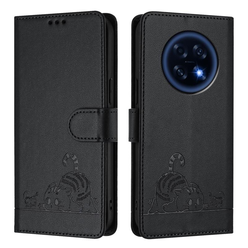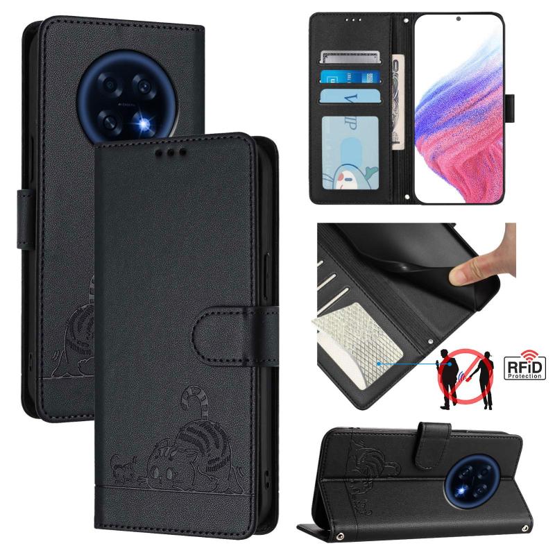 For OPPO A6 GT 5G Cat Rat Embossed Pattern RFID Leather Phone Case with Lanyard(Black)
