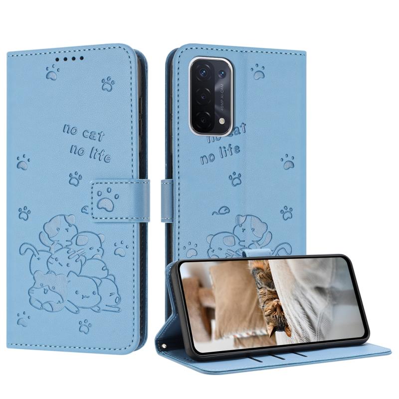 For OPPO A74 5G / A93 5G Embossed Kitten Phone Leather Case with Lanyard(Blue)