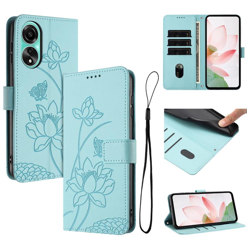 For OPPO A78 4G Lotus Embossed Leather Phone Case with Lanyard(Green)