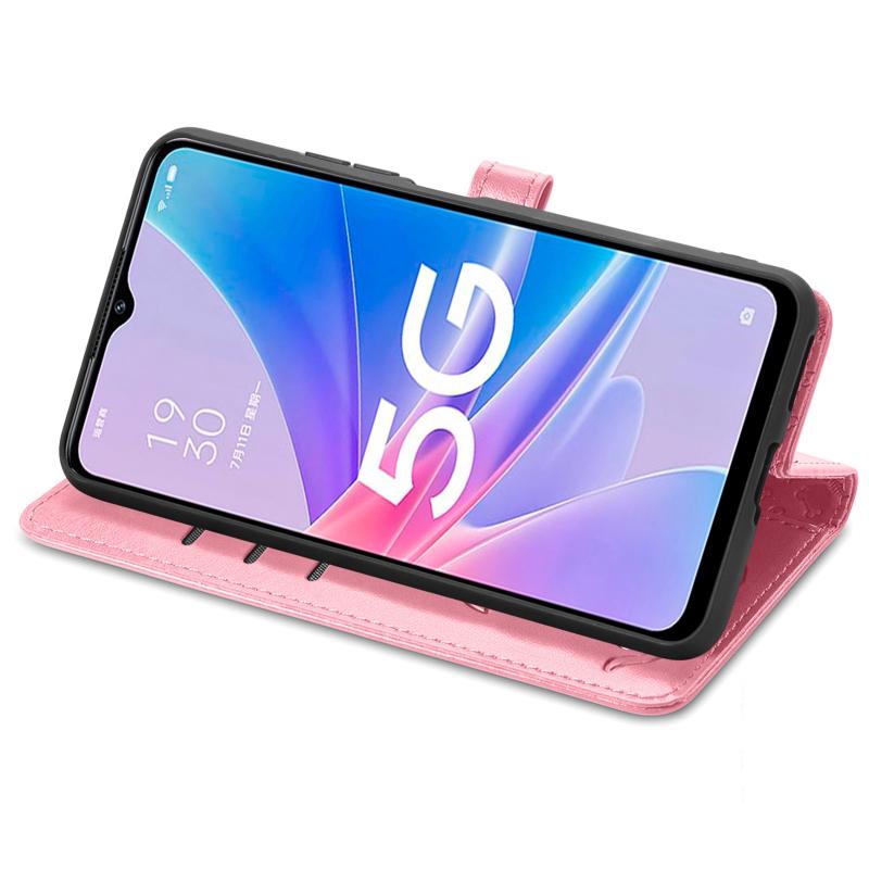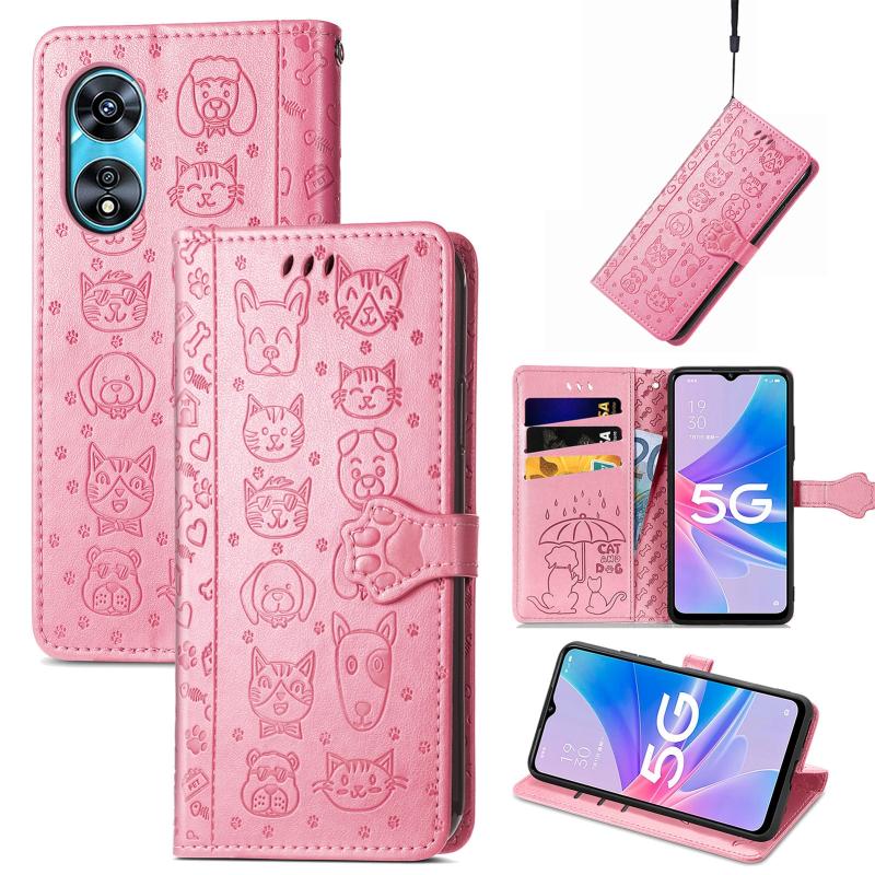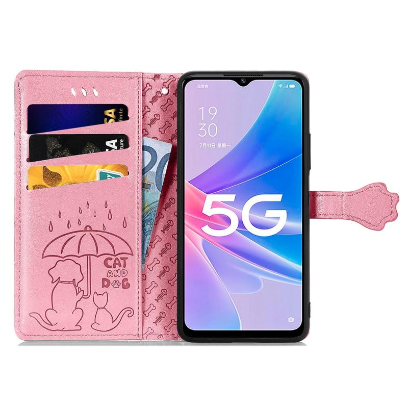 For OPPO A97 5G Cat and Dog Embossed Leather Phone Case(Pink)