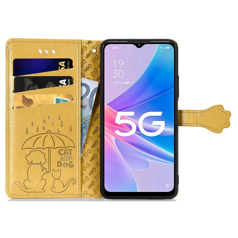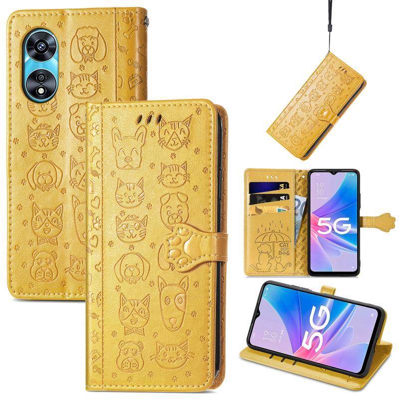 For OPPO A97 5G Cat and Dog Embossed Leather Phone Case(Yellow)