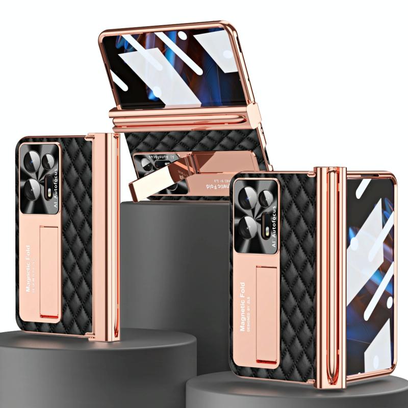 For OPPO Find N2 Rhombus Pattern Electroplated Plain Leather Phone Case with Pen Slot(Black)