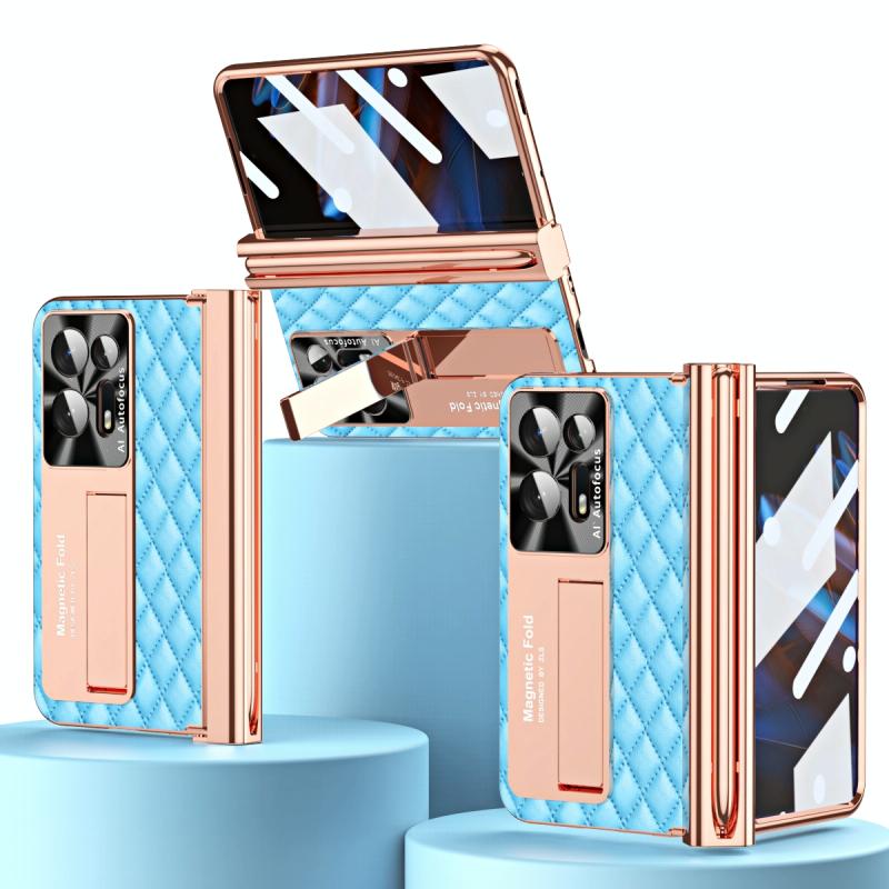 For OPPO Find N2 Rhombus Pattern Electroplated Plain Leather Phone Case with Pen Slot(Blue)