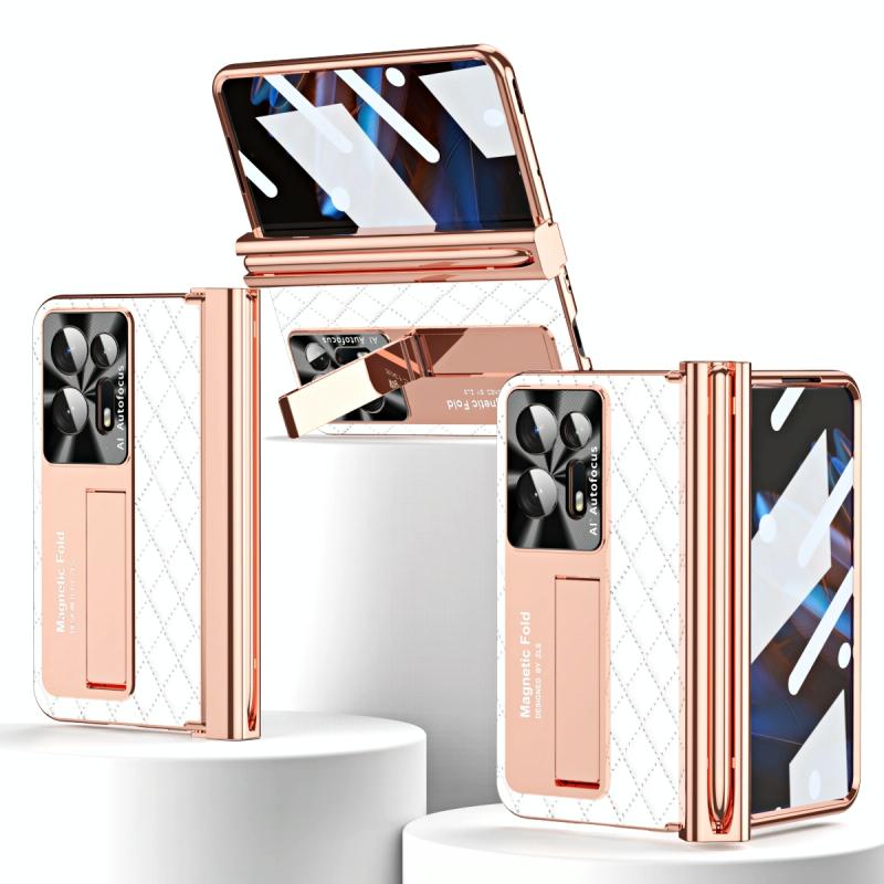 For OPPO Find N2 Rhombus Pattern Electroplated Plain Leather Phone Case with Pen Slot(White)