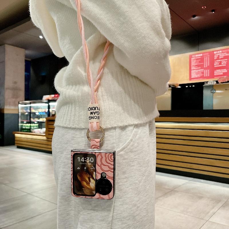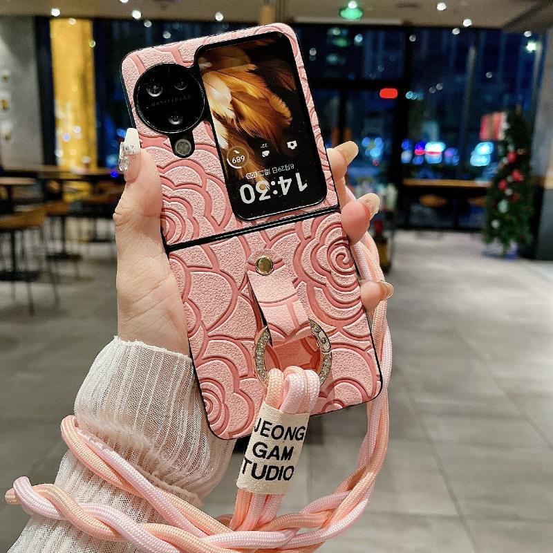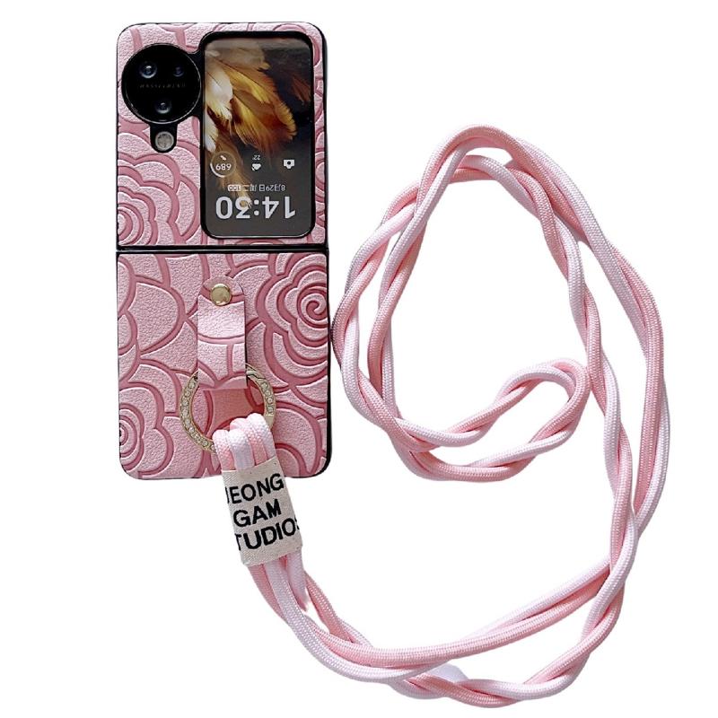 For OPPO Find N3 Flip Impression Camellia Pattern Protective Phone Case with Diamond Ring Long Lanyard(Pink)