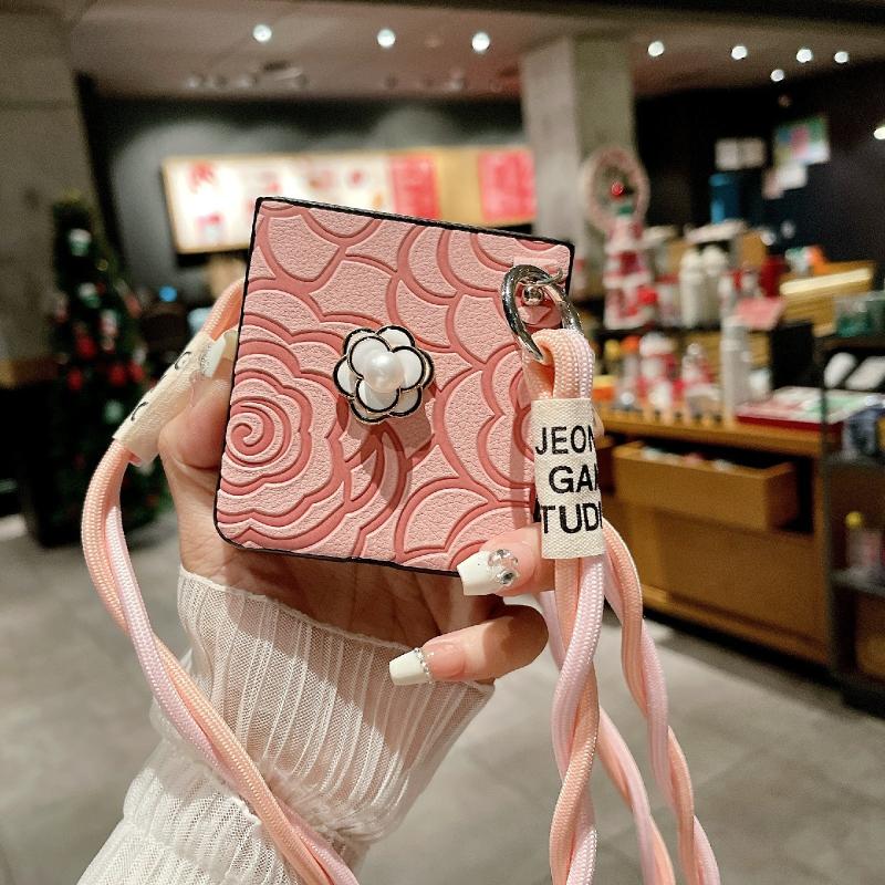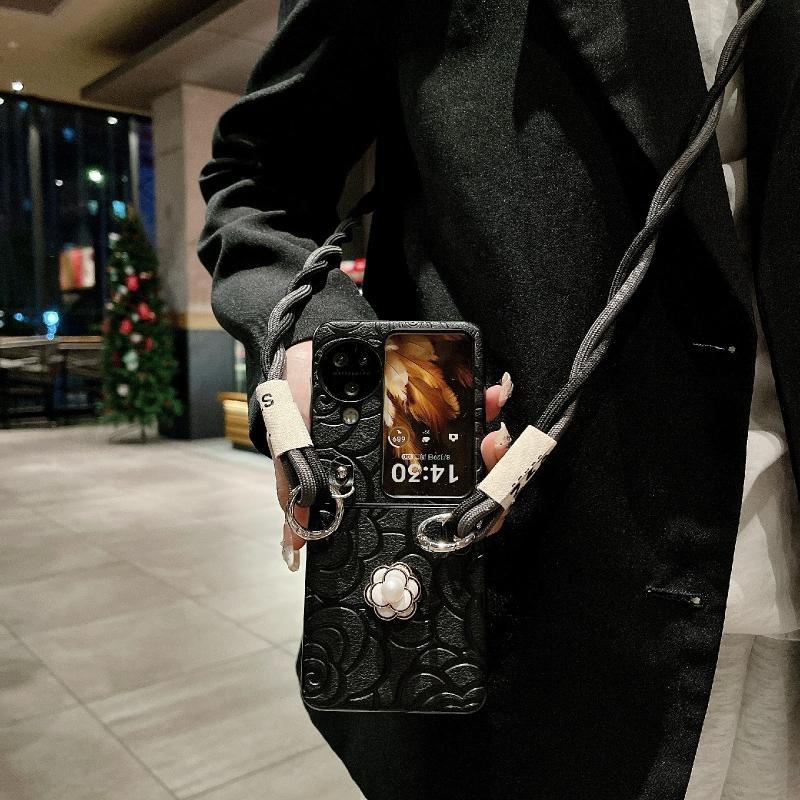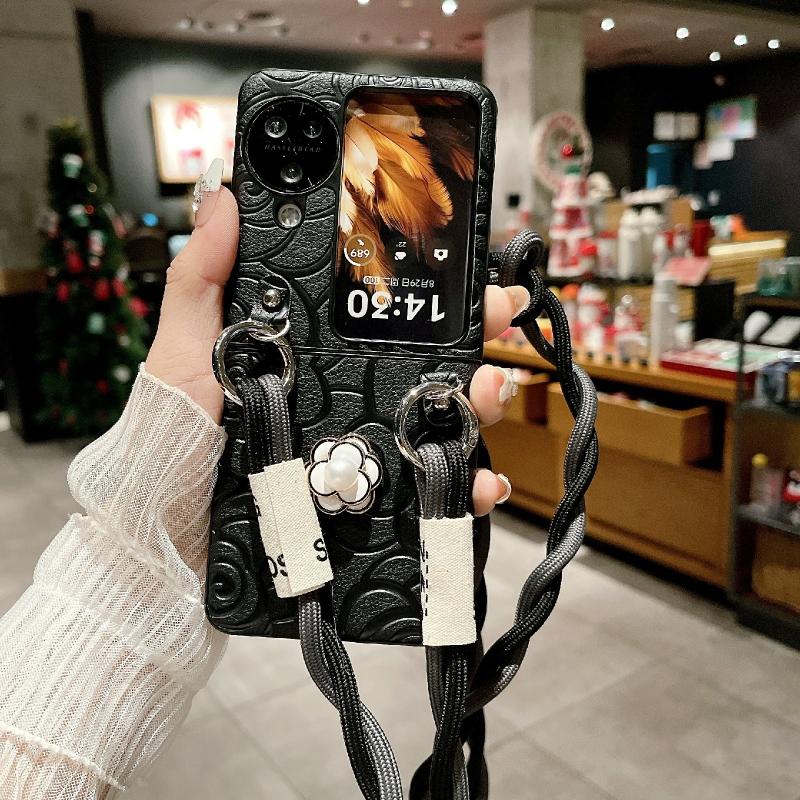 For OPPO Find N3 Flip Impression Camellia Pattern Protective Phone Case with Long Lanyard(Black)
