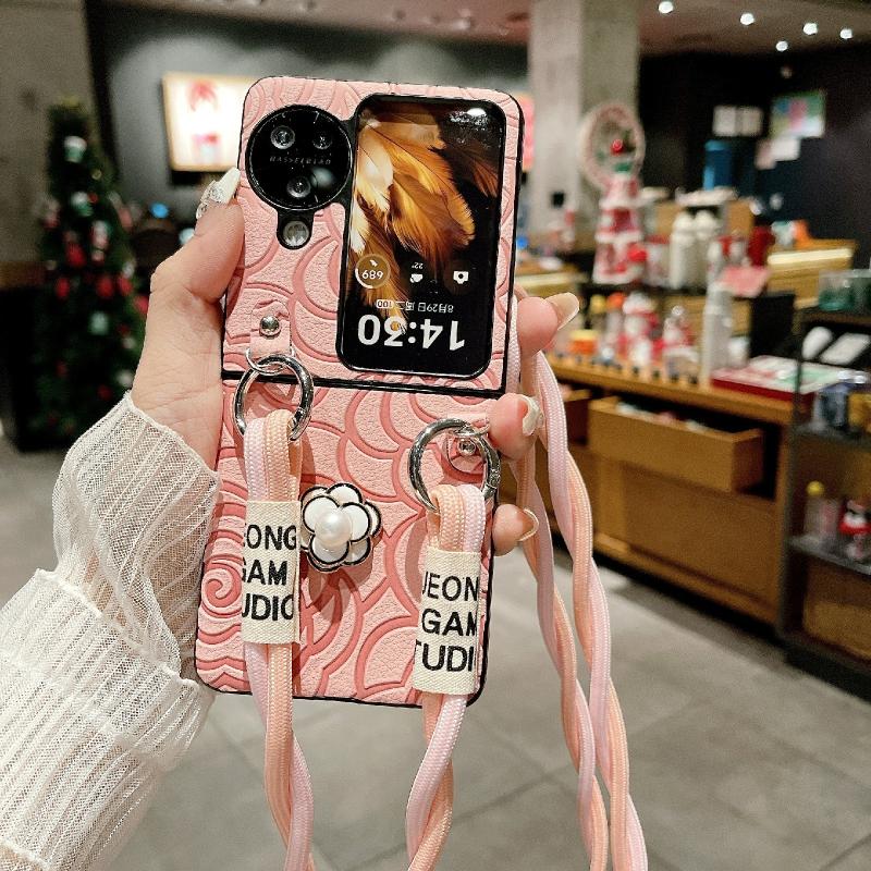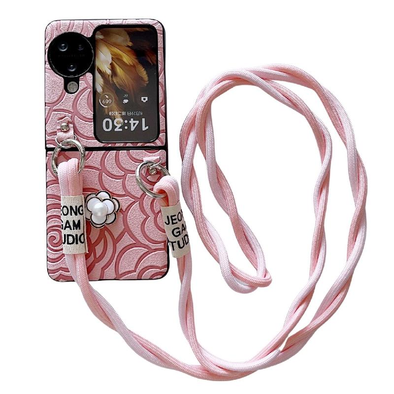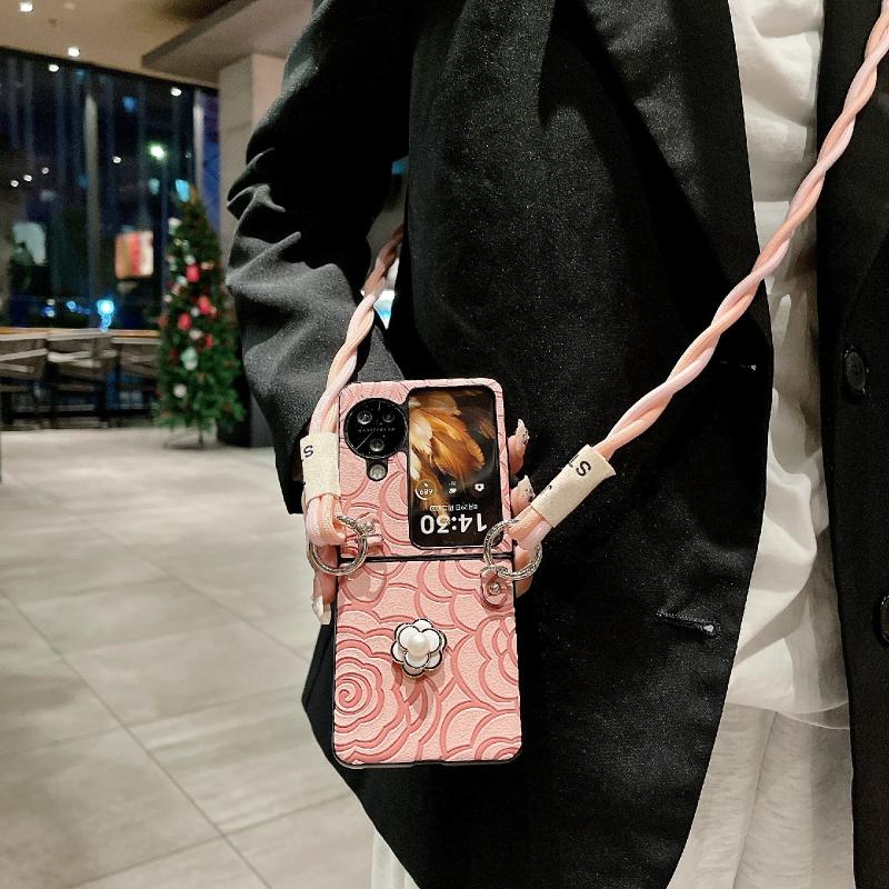 For OPPO Find N3 Flip Impression Camellia Pattern Protective Phone Case with Long Lanyard(Pink)