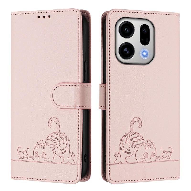 For OPPO Find X9 Cat Rat Embossed Pattern RFID Leather Phone Case with Lanyard(Pink)