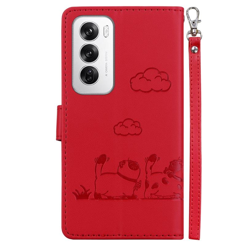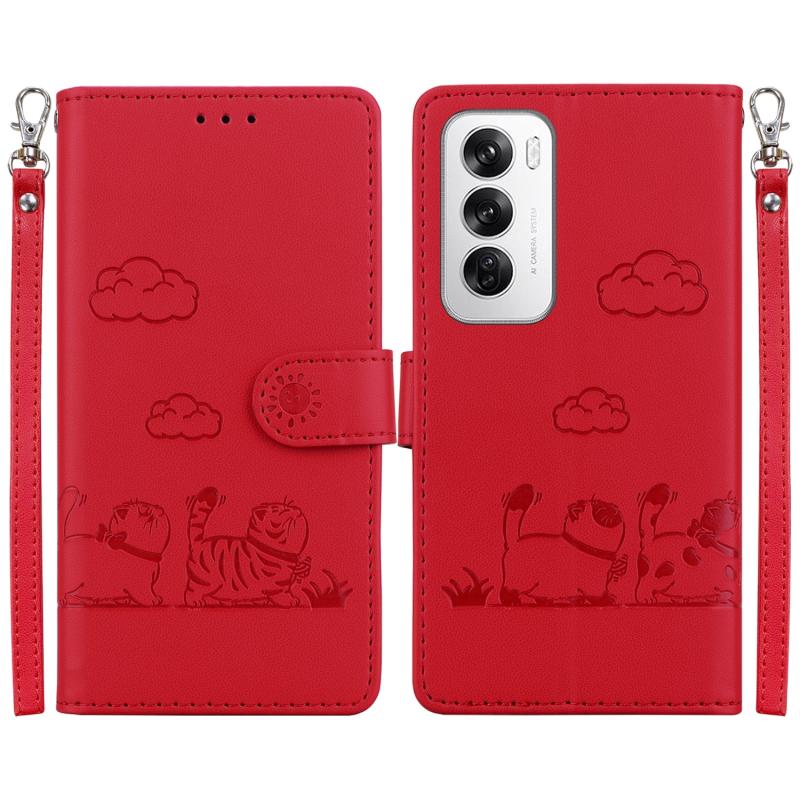 For OPPO Reno12 5G Global Cute Cats RFID Leather Phone Case(Red)