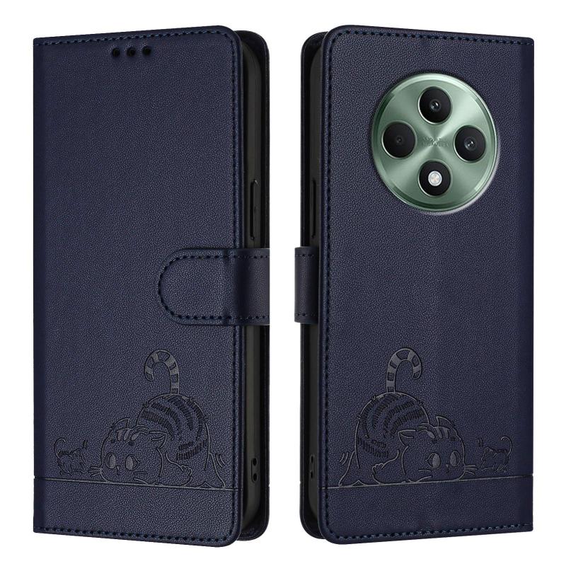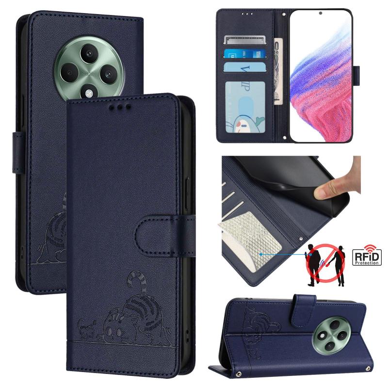 For OPPO Reno12 F Global Cat Rat Embossed Pattern RFID Leather Phone Case with Lanyard(Blue)