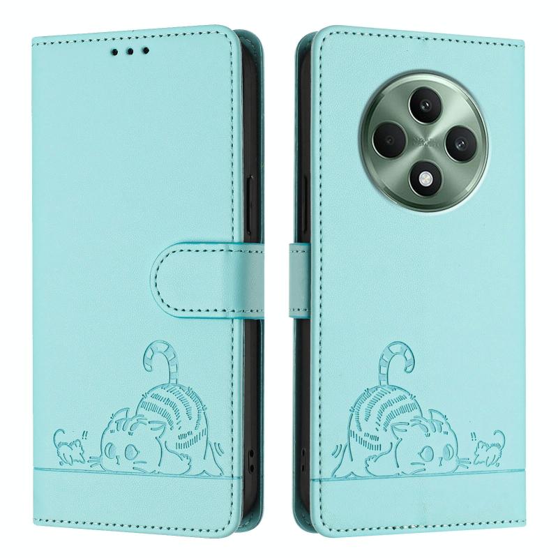 For OPPO Reno12 F Global Cat Rat Embossed Pattern RFID Leather Phone Case with Lanyard(Mint Green)