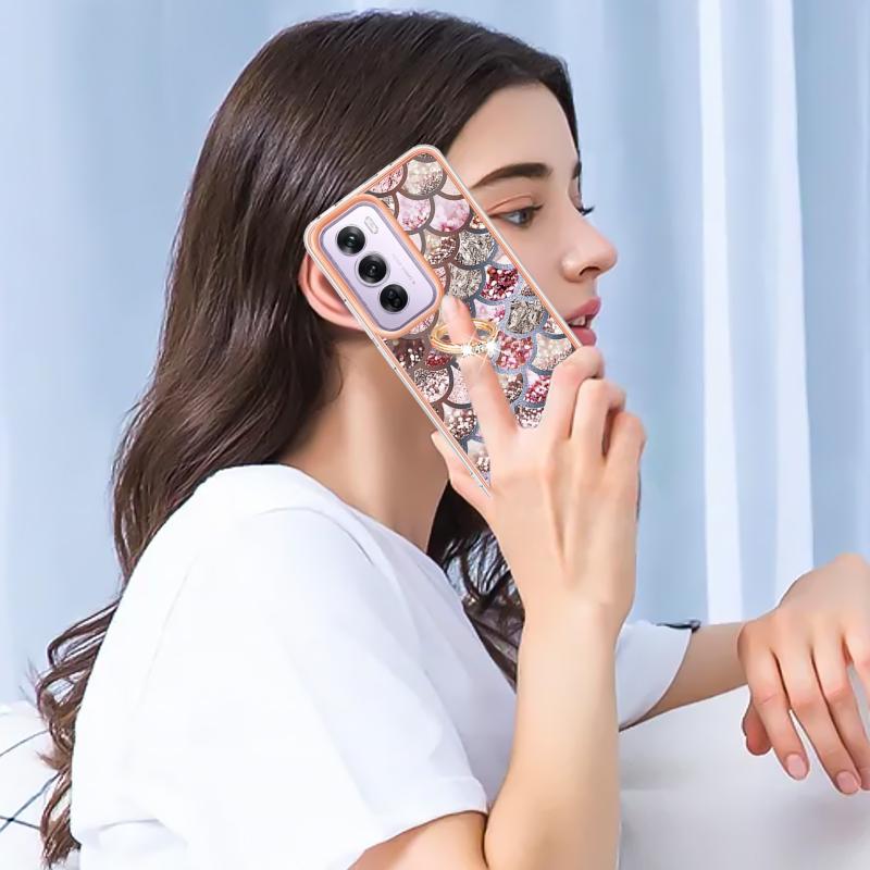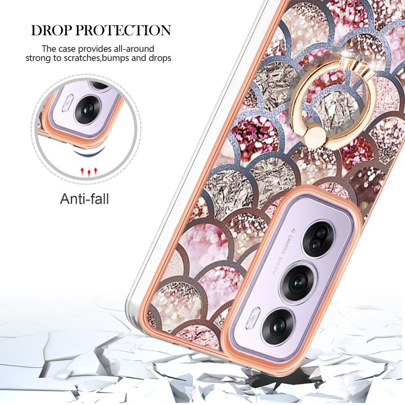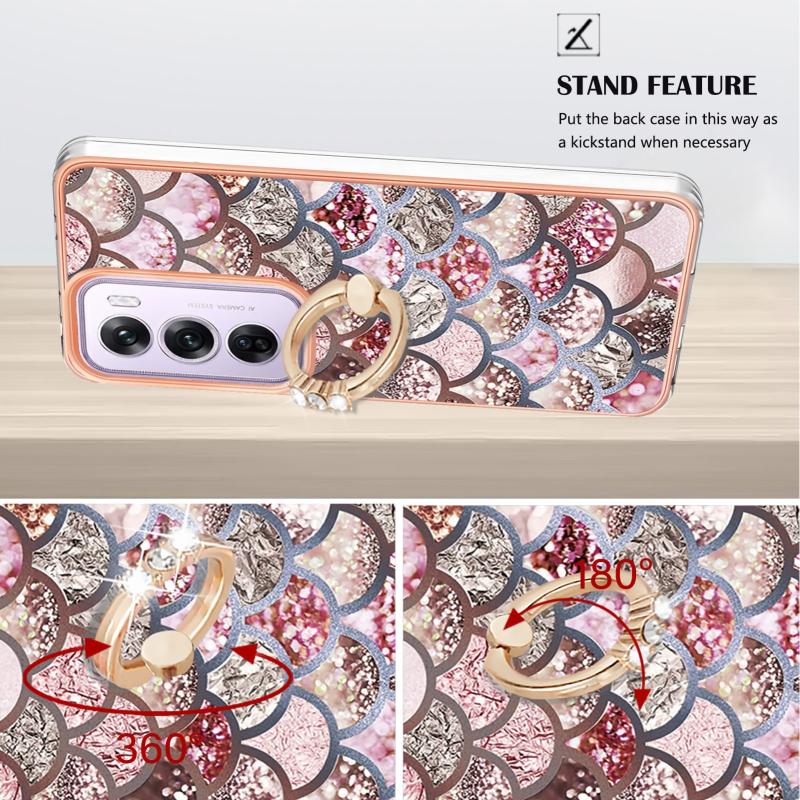 For OPPO Reno12 Pro Global Electroplating Pattern IMD TPU Shockproof Case with Rhinestone Ring Holder(Pink Scales)