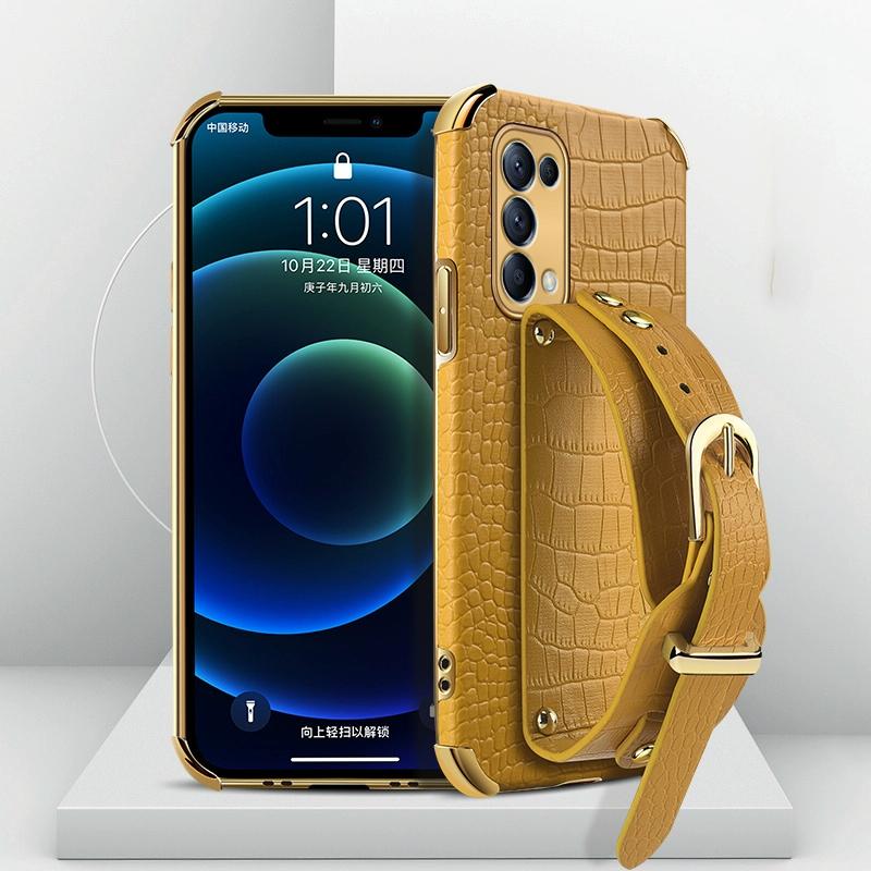 For OPPO Reno5 Electroplated TPU Crocodile Pattern Leather Case with Wrist Strap(Yellow)