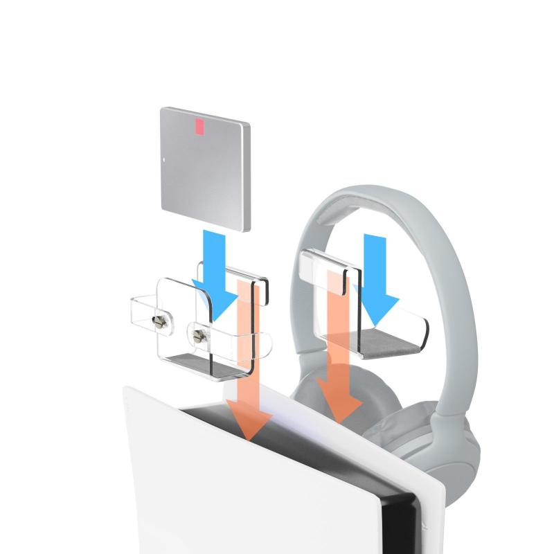 1. This is an overhead storage hanger specifically designed for the PS5 console. It features a practical two-hook design to help you organize controllers, headsets, and hard drives neatly above your console, saving valuable space.