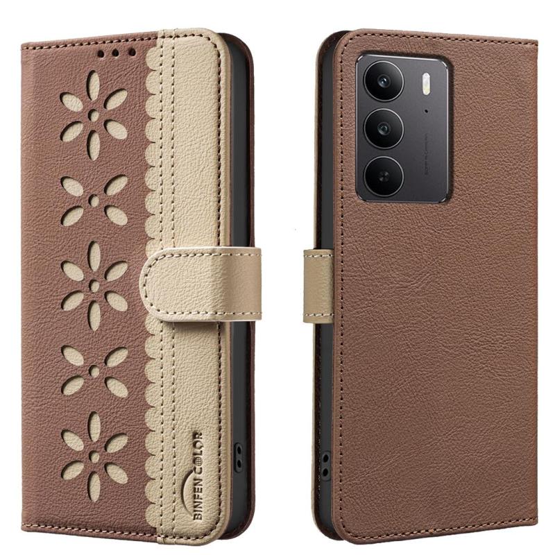 For Realme C75 4G Splicing Color Hollow Flower Pattern RFID Leather Phone Case(Brown)