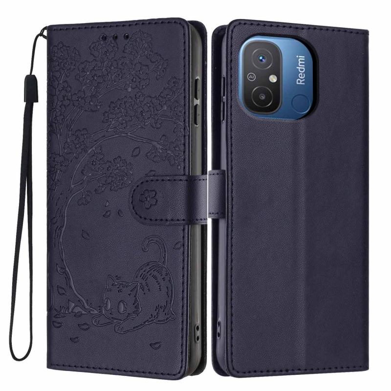 For Redmi 12C Tree Cat Embossed Flip Vegan Leather Phone Case(Dark Blue)