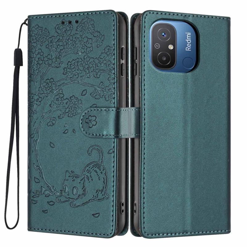 For Redmi 12C Tree Cat Embossed Flip Vegan Leather Phone Case(Deep Green)