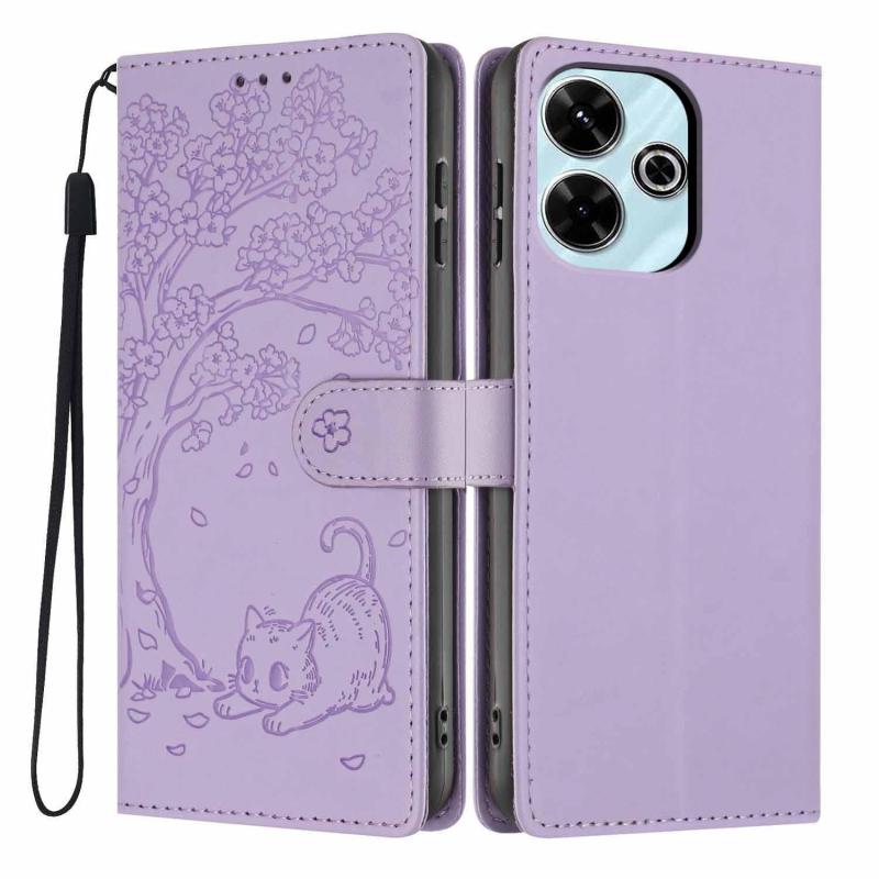 For Redmi 13 4G Tree Cat Embossed Flip Vegan Leather Phone Case(Purple)