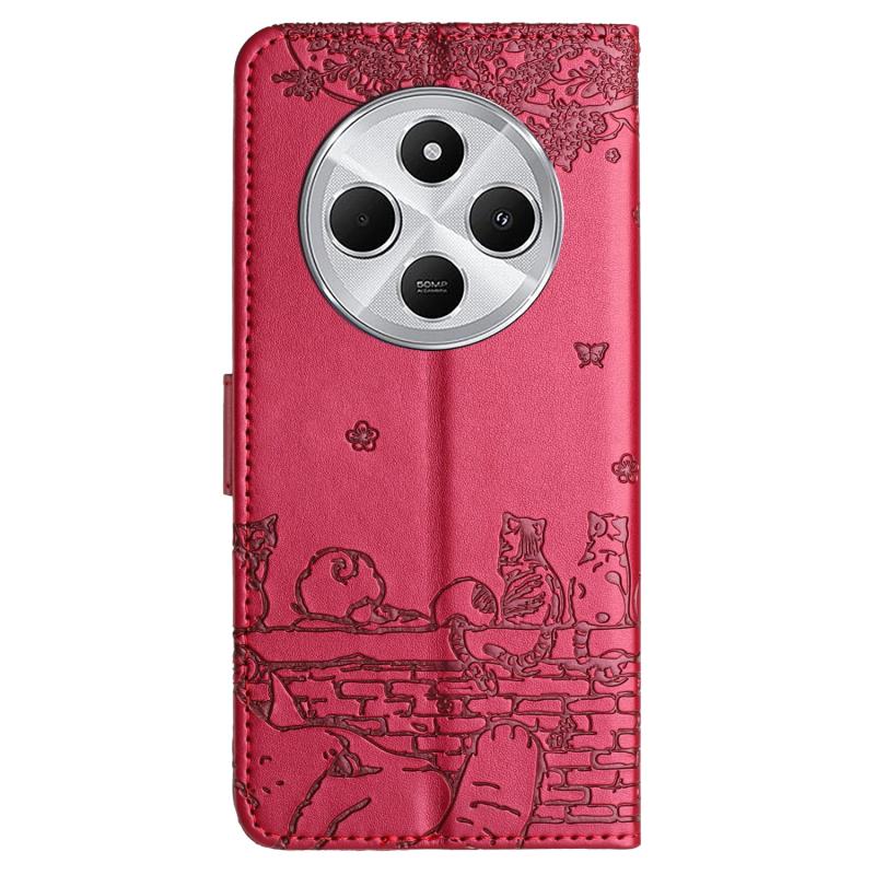 For Redmi 14C 4G Cat Embossing Pattern Leather Phone Case with Lanyard(Red)