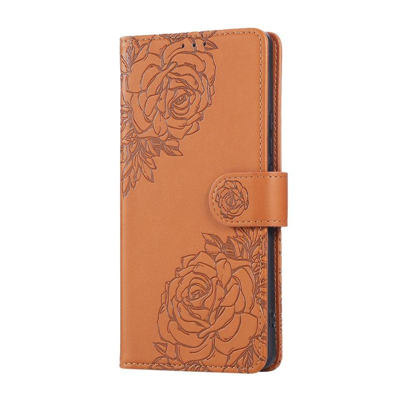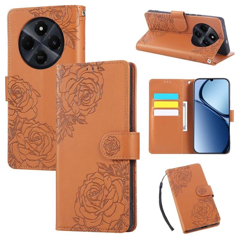 For Redmi 14C 4G Rose Flower Embossed 3-Card Slots Leather Phone Case(Brown)