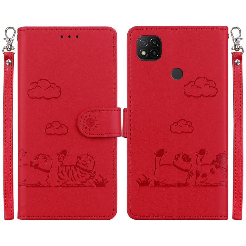 For Redmi 9C / 9 Activ Cute Cats RFID Leather Phone Case(Red)