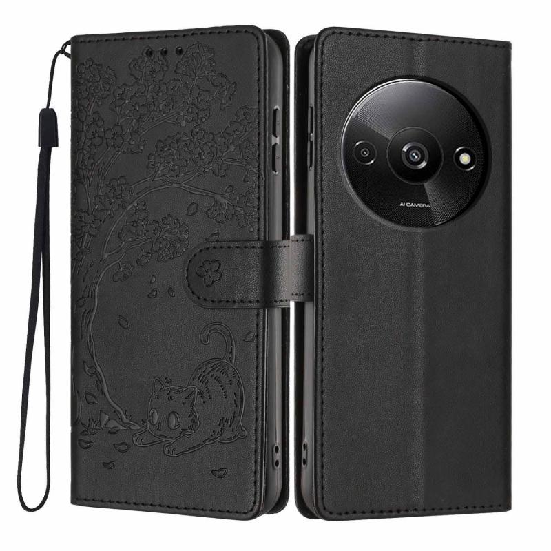 For Redmi A3 4G / A3X 4G Tree Cat Embossed Flip Vegan Leather Phone Case(Black)
