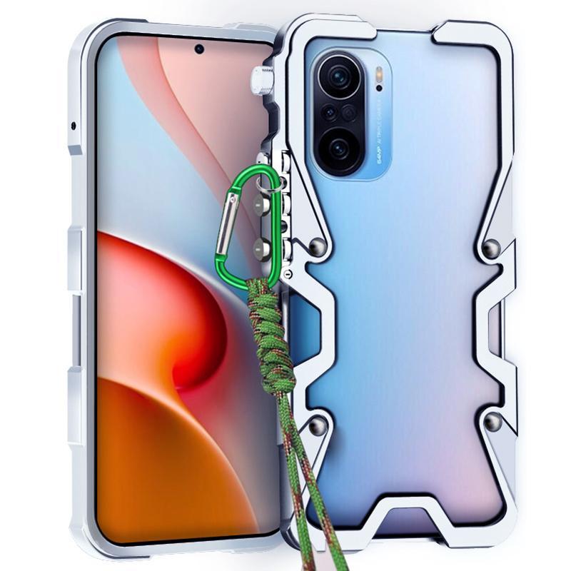For Redmi K40 Pro Trigger Design Hollow Metal Frame Phone Case with Lanyard(Silver)