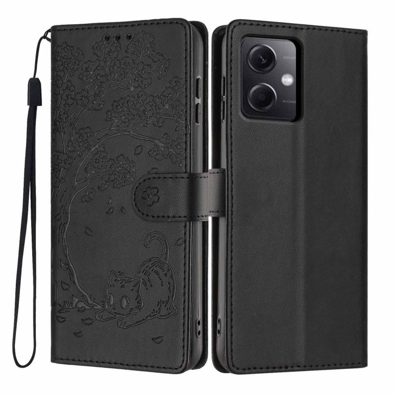 For Redmi Note 12 5G / Poco X5 Tree Cat Embossed Flip Vegan Leather Phone Case(Black)