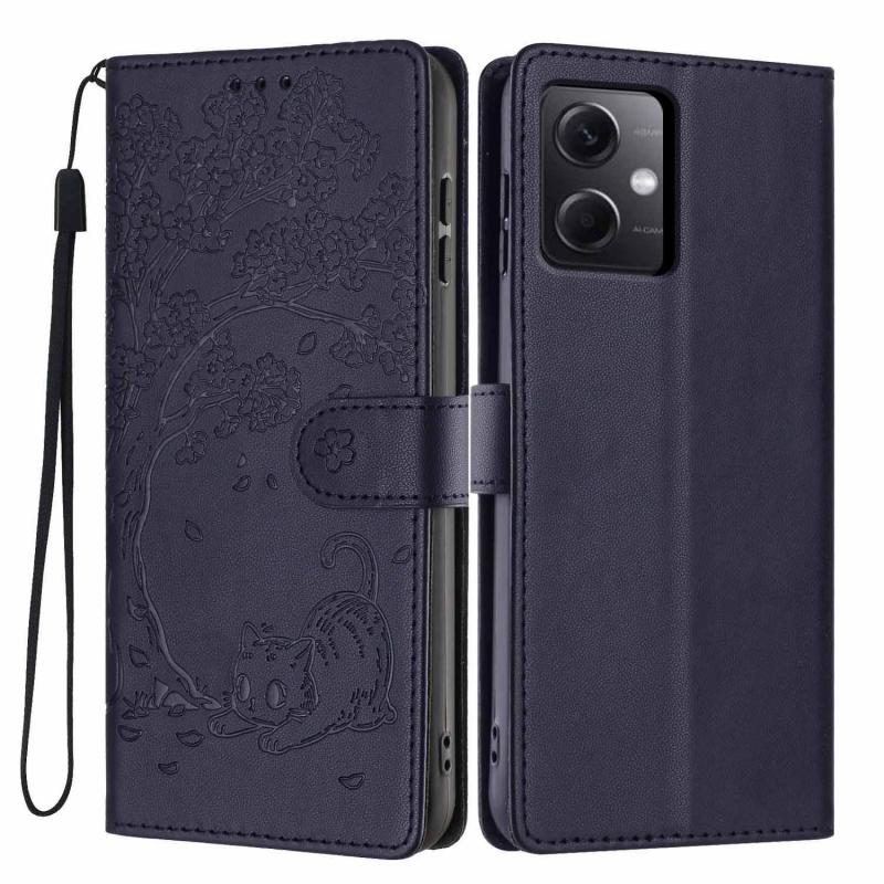 For Redmi Note 12 5G / Poco X5 Tree Cat Embossed Flip Vegan Leather Phone Case(Dark Blue)