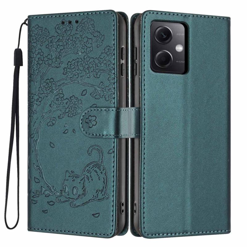 For Redmi Note 12 5G / Poco X5 Tree Cat Embossed Flip Vegan Leather Phone Case(Deep Green)