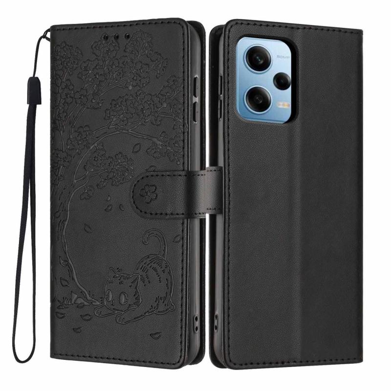 For Redmi Note 12 Pro 5G Global Tree Cat Embossed Flip Vegan Leather Phone Case(Black)