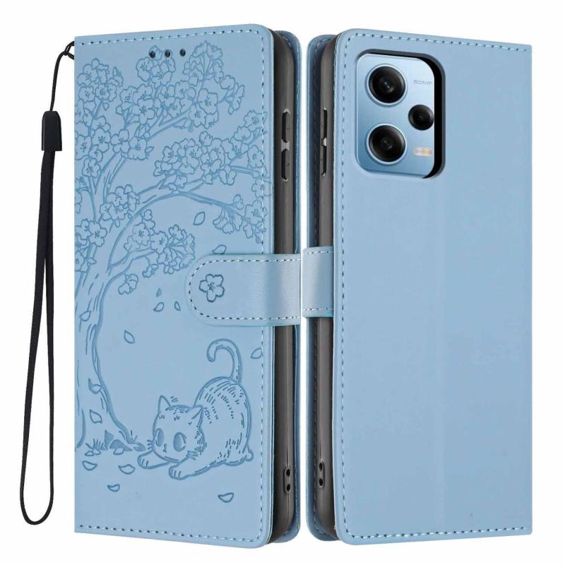 For Redmi Note 12 Pro 5G Global Tree Cat Embossed Flip Vegan Leather Phone Case(Sky Blue)