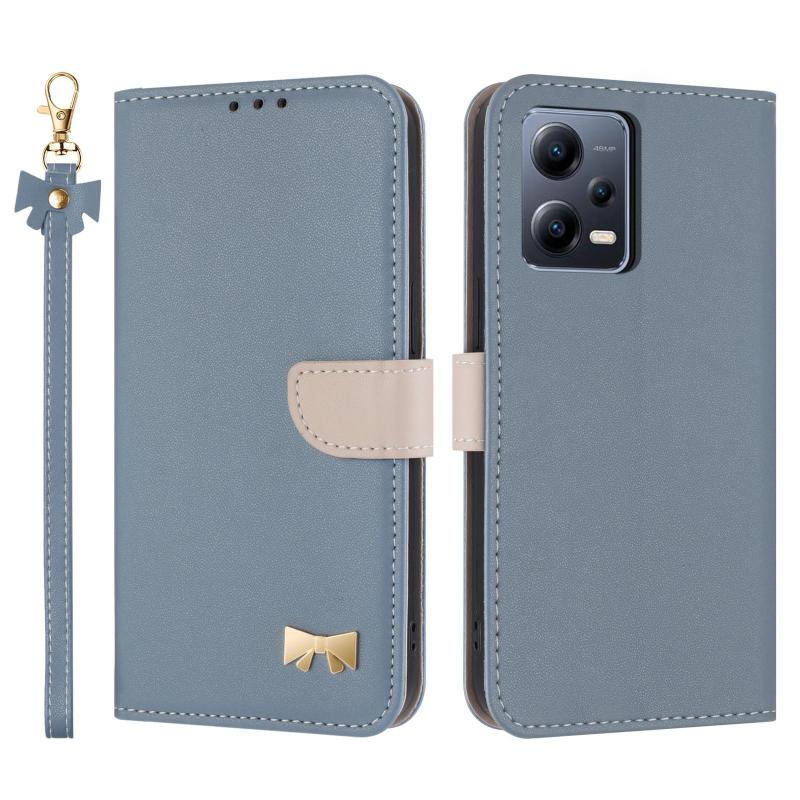 For Redmi Note 12 Pro 5G Metal Bow Leather Phone Case with Hand Strap(Light Blue)