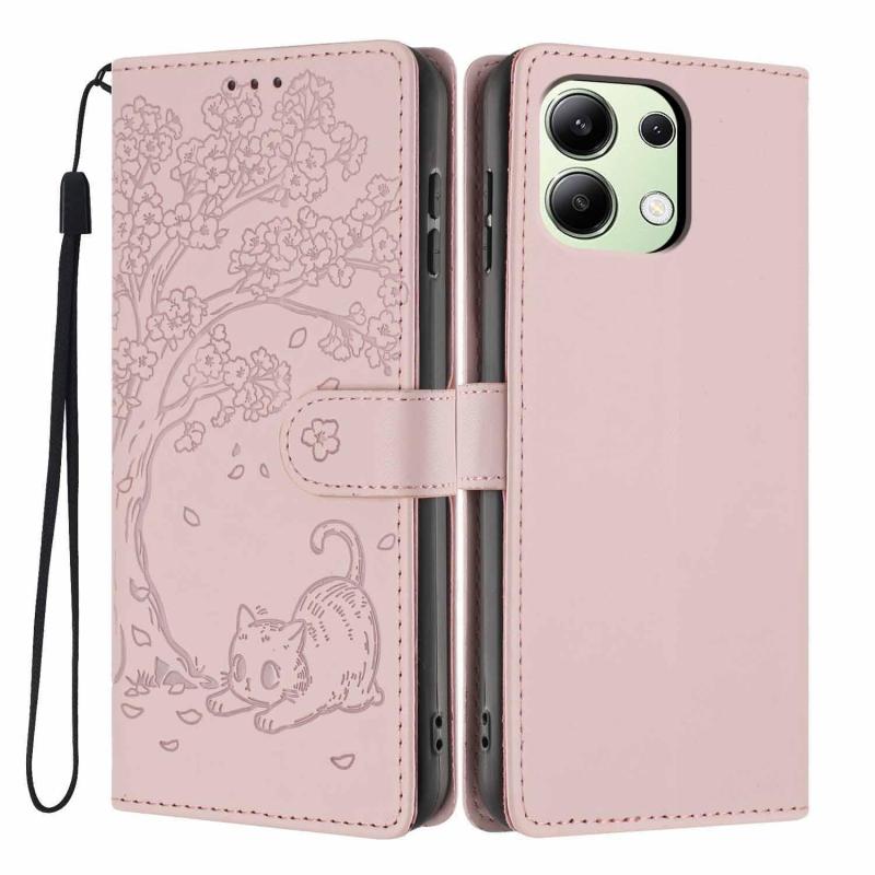 For Redmi Note 13 4G Tree Cat Embossed Flip Vegan Leather Phone Case(Rose Gold)