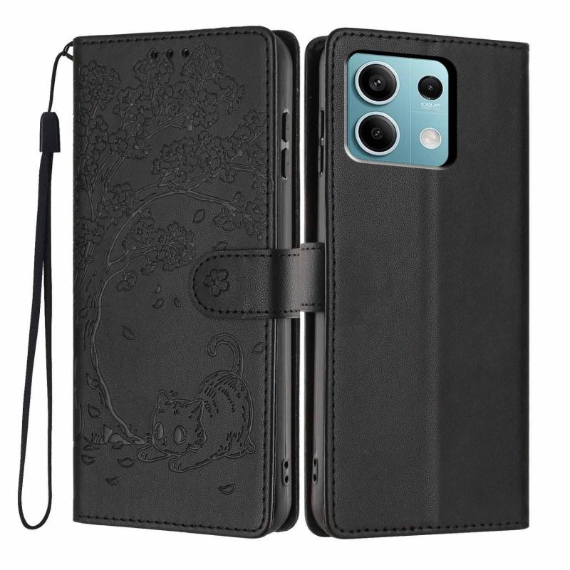 For Redmi Note 13 5G Tree Cat Embossed Flip Vegan Leather Phone Case(Black)