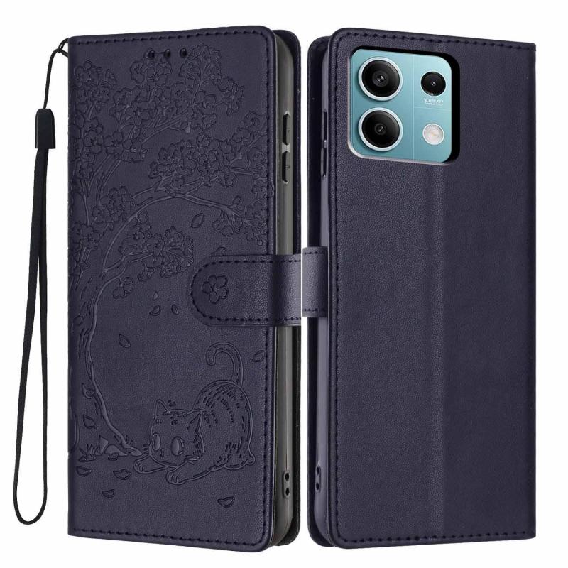 For Redmi Note 13 5G Tree Cat Embossed Flip Vegan Leather Phone Case(Dark Blue)
