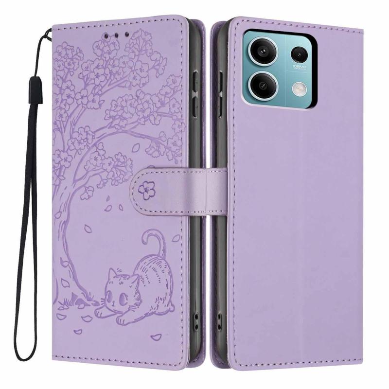 For Redmi Note 13 5G Tree Cat Embossed Flip Vegan Leather Phone Case(Purple)