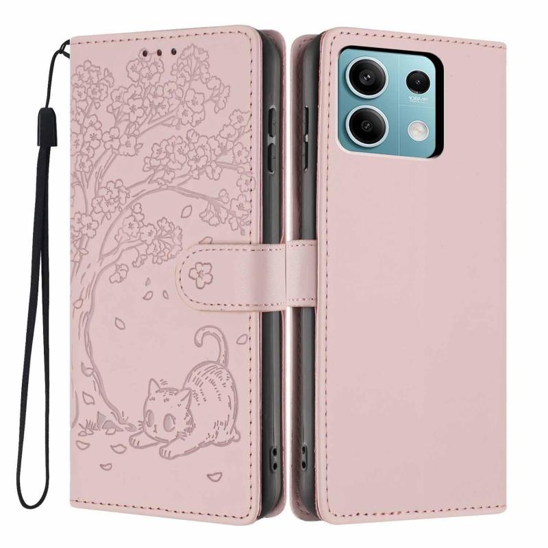 For Redmi Note 13 5G Tree Cat Embossed Flip Vegan Leather Phone Case(Rose Gold)