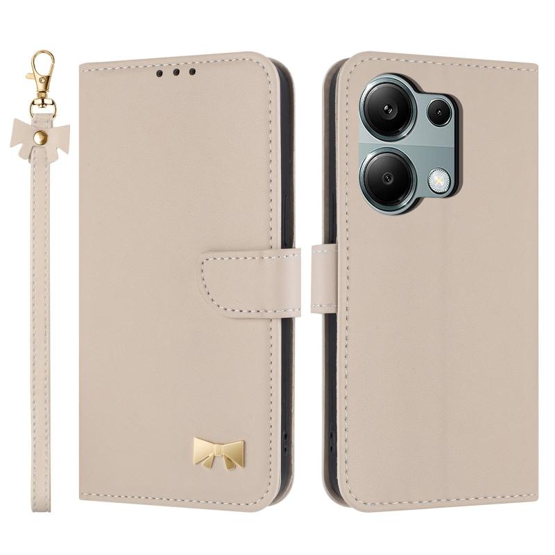 For Redmi Note 13 Pro 4G Global Metal Bow Leather Phone Case with Hand Strap(Apricot)