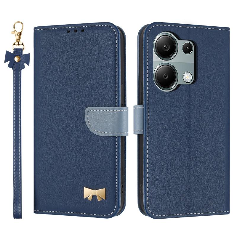 For Redmi Note 13 Pro 4G Global Metal Bow Leather Phone Case with Hand Strap(Dark Blue)