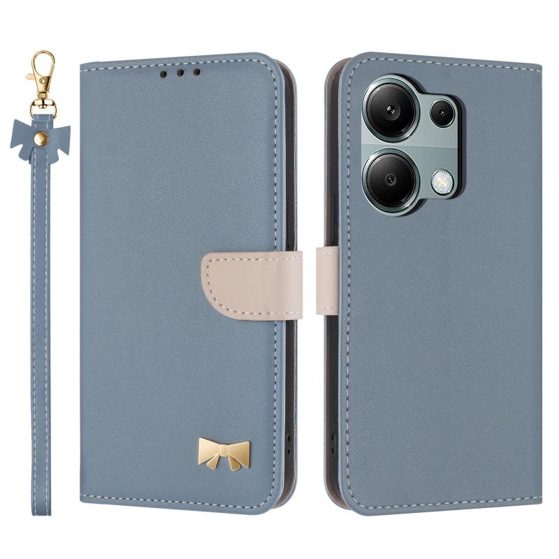 For Redmi Note 13 Pro 4G Global Metal Bow Leather Phone Case with Hand Strap(Light Blue)