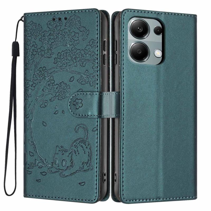 For Redmi Note 13 Pro 4G Tree Cat Embossed Flip Vegan Leather Phone Case(Deep Green)
