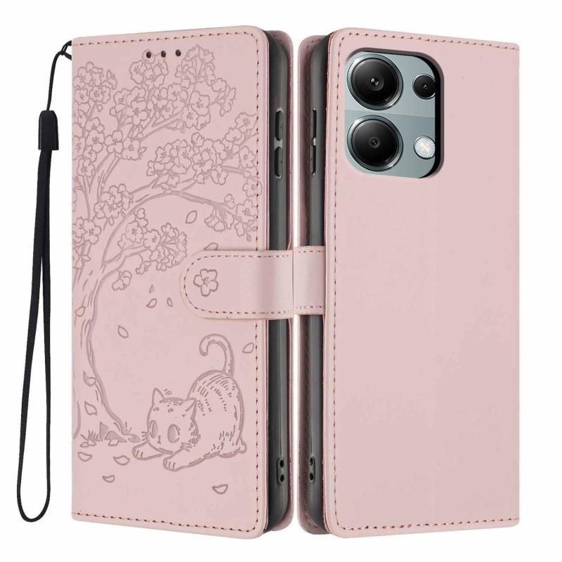 For Redmi Note 13 Pro 4G Tree Cat Embossed Flip Vegan Leather Phone Case(Rose Gold)